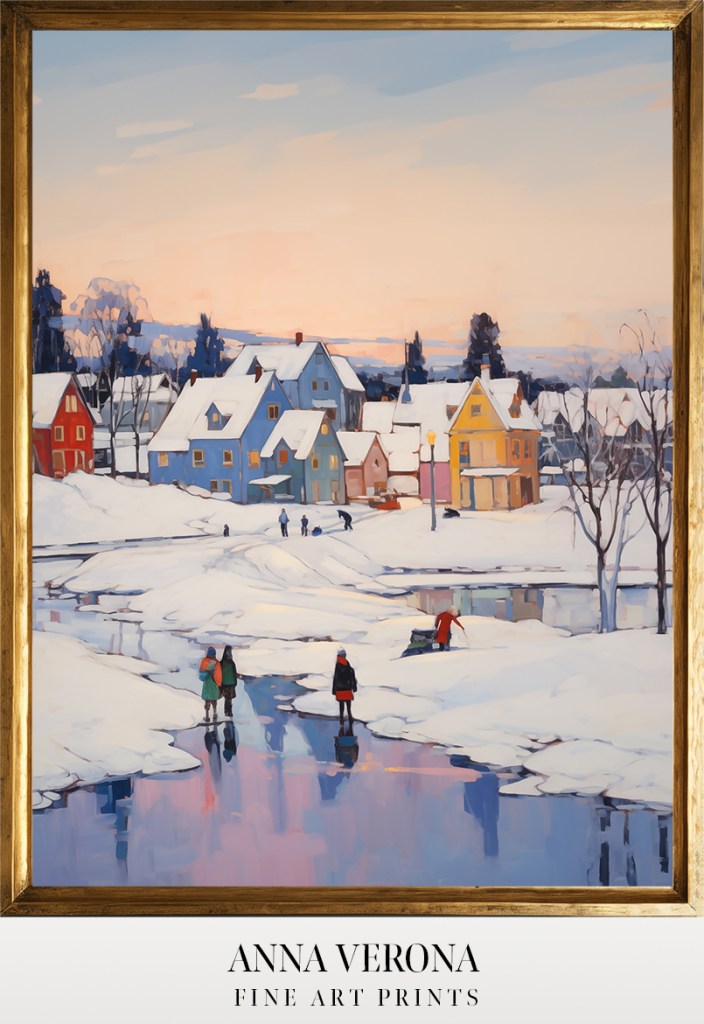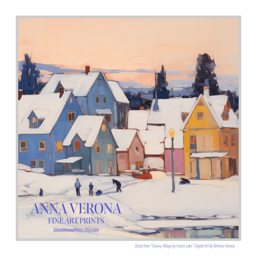 “Snowy Village by Frozen Lake” is available as a digital artwork ready to download and print, at my Etsy store: AnnaVeronaPrints.Etsy.com
