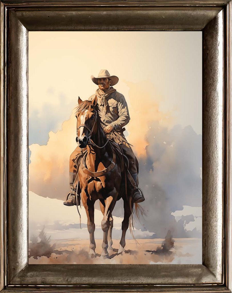 As the sun rises painting the sky with hues of gold, a lone figure commands attention. Full of rugged charm, this image captures the essence of a modern-day cowboy, the dynamic spirit of young men seeking adventure.