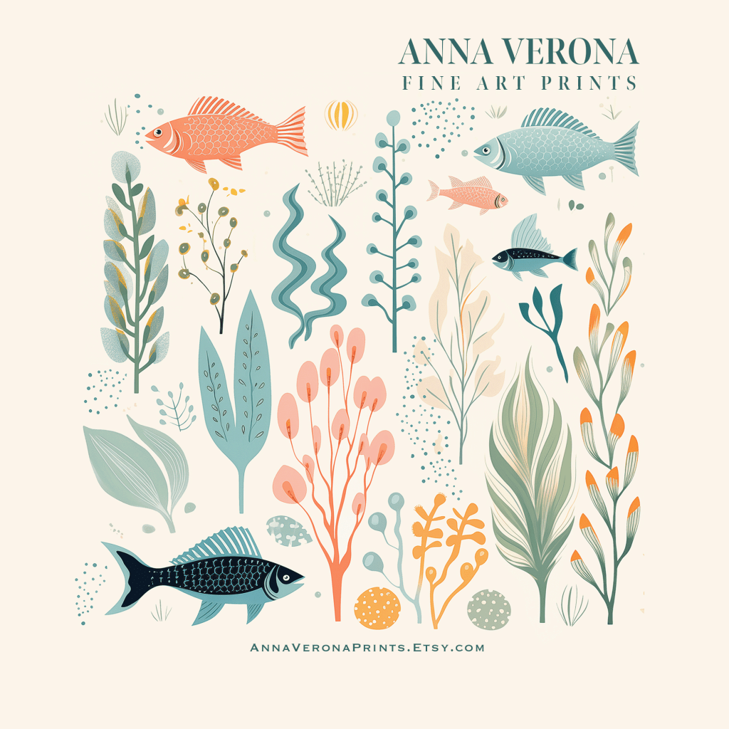 My New digital illustration features a stylized underwater scene with fish and aquatic plants, arranged in a harmonious, nature-inspired composition.