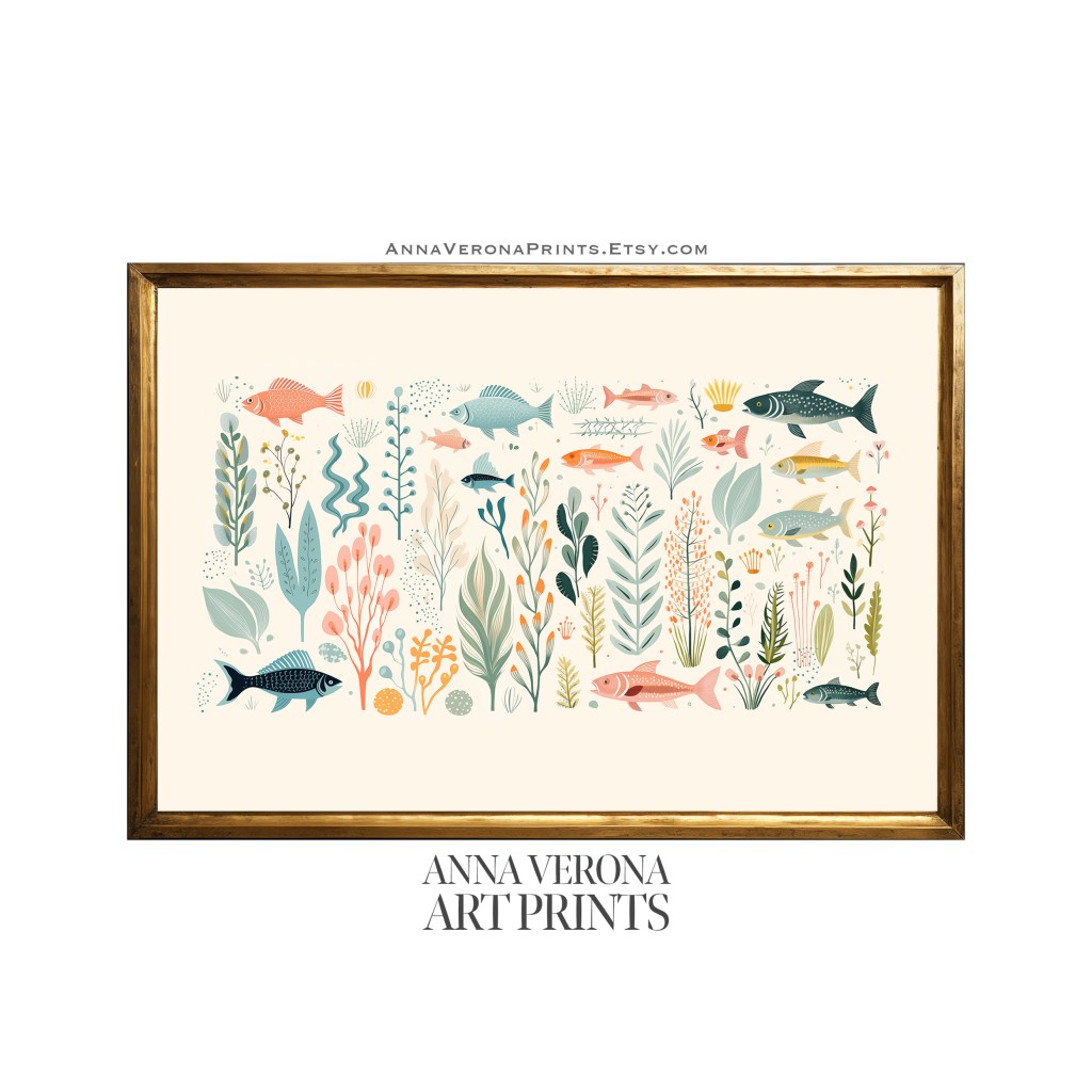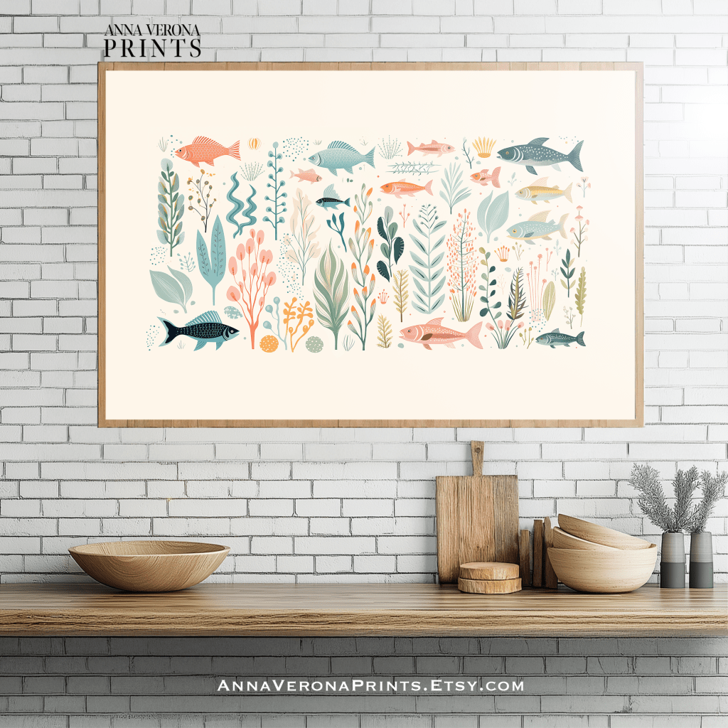 The choice of soft pastel color palette of blues, corals, and earthy greens lends a modern, Scandinavian aesthetic, making it ideal for contemporary and coastal decor. The intricate yet minimalist illustration style aligns with current trends in whimsical and botanical art, perfect for beach house interiors, or tranquil living spaces.