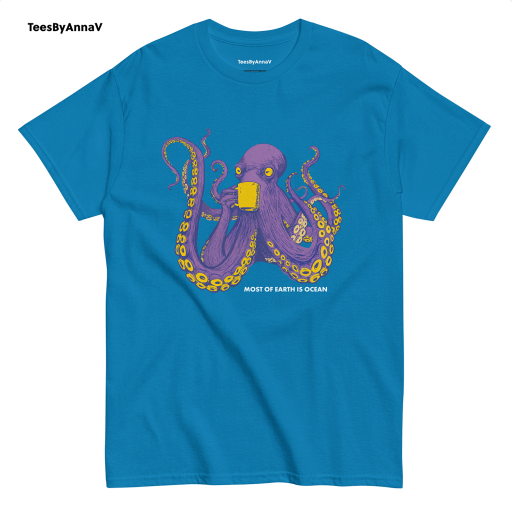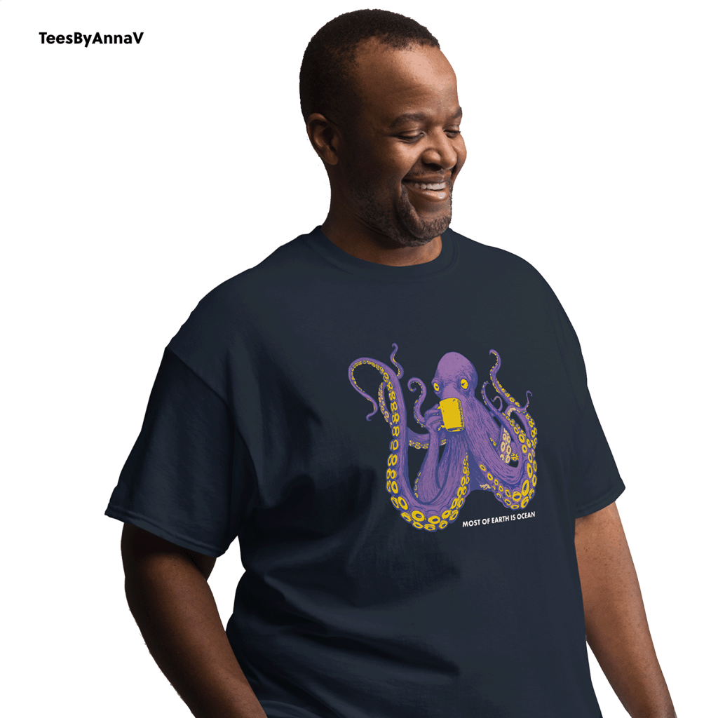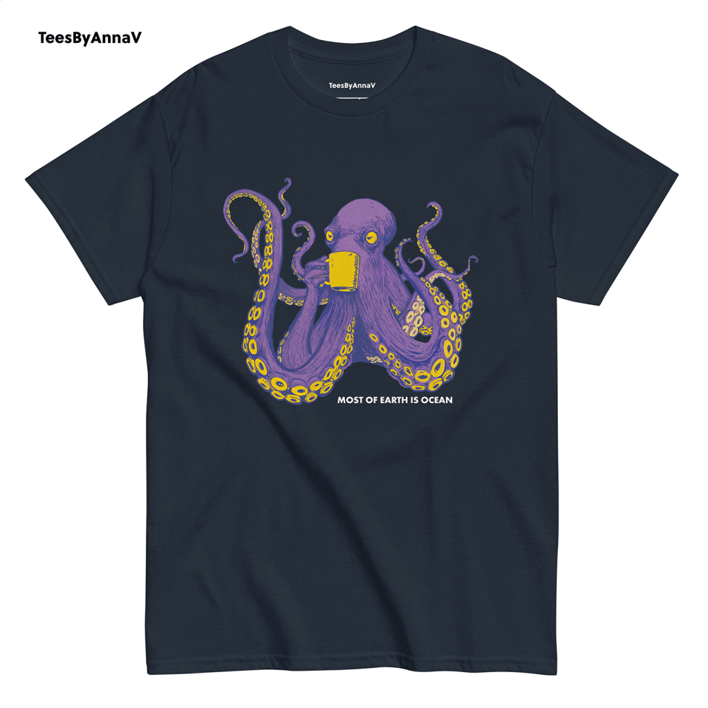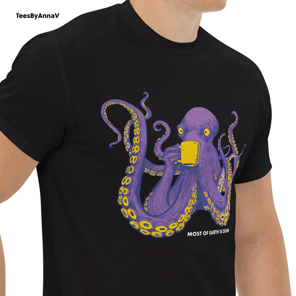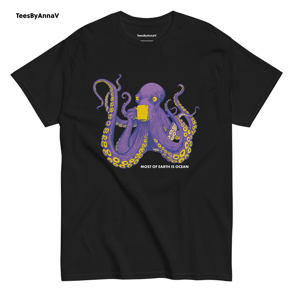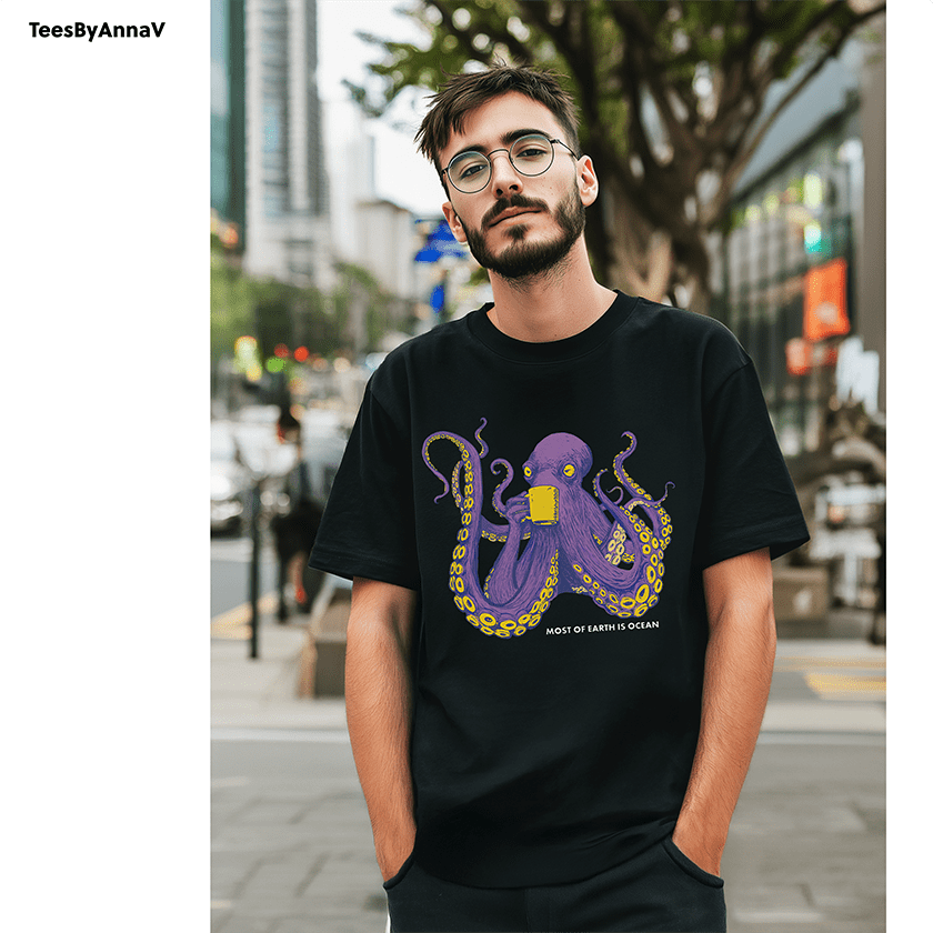 This design blends two of my favorite worlds — marine life and the bold lines of comic book art. The octopus is drawn in a playful yet powerful style, purple and vibrant, calmly sipping from a mug as if it knows the secrets of the deep. Below, the words “Most of Earth is Ocean” give a little nod to ocean science, reminding us how much of our planet remains mysterious, hidden beneath the waves.
