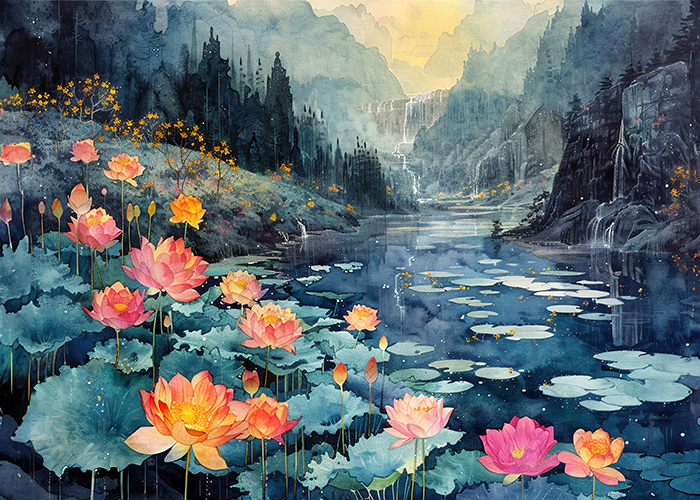 Misty Mountain River and Water Blooms Digital Art By AnnaV Frame Format-Ratio 5:7